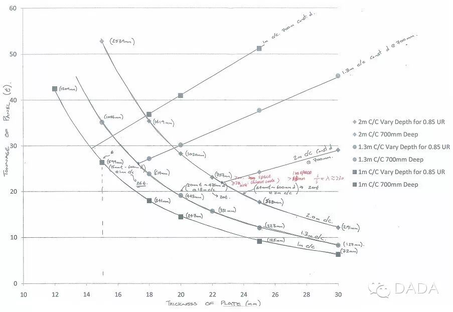 曲面钢格栅在总体用钢量当中占很大比重,在主体结构难以压缩的条件下,压缩曲面格栅的用钢量成为控制造价的关键。钢格栅从建筑效果考虑希望尽可能薄,同时有大的进深。太薄结构强度不满足,进深增大直接增加造价。如何决定最佳格栅参数,仅从建筑效果角度考虑难以决定。此时结构设计提出了一套参数化结构计算模型,将几何尺寸变化对结构的关联关系以多条曲面表达,曲线上每一点的对应参数均可满足结构设计要求。在这一技术的辅助下,结合造价统计程序,建筑师迅速准确的选定了造价范围内的最佳几何尺寸参数。