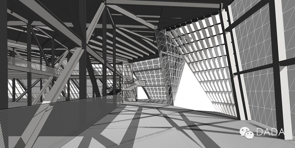 通用空间。用地北部为已建研究厂房,南侧为基地边界的自然土坡。结合内部空间要求和外部环境,创展中心由十四米柱跨的方盒子开始,将屋顶及东侧、南侧墙体撕裂,扭转,形成光线和空气进入建筑的通道。扭转的墙体虚实相间,分别转化为封闭的曲面钢幕墙和扭曲的钢格栅。支撑斜柱隐藏在曲面幕墙以内,钢格栅在增强通风效果的同时也作为遮阳构件。两者虚实相间形成的丰富形体,与南侧自然地形相呼应。为了实现这一设计构思,从几何形态、参数化设计技术、构造节点等方面提出了相应的措施。