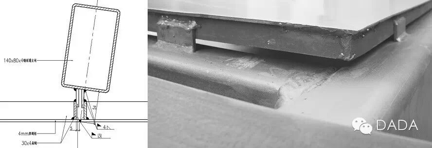 曲面钢板幕墙是由多个小的平面单元拼接而成,初期方案担心安装精度难以保证,将幕墙单元拼接设计为明缝。这一设计需要在钢板背面增加防水层,构造复杂,造价难以承受。因此将幕墙拼缝改为焊接密封,焊缝允许的最大宽度有限,且幕墙单元数量较多,精度要求较高。幕墙节点设计进行了不同方案的试样对比研究,最终采取在每一幕墙单元设可调节的定位钢片进行初步定位,待整片幕墙对缝确认完毕后再焊接固定的方法。实际应用的效果简便易行,安装快速。
