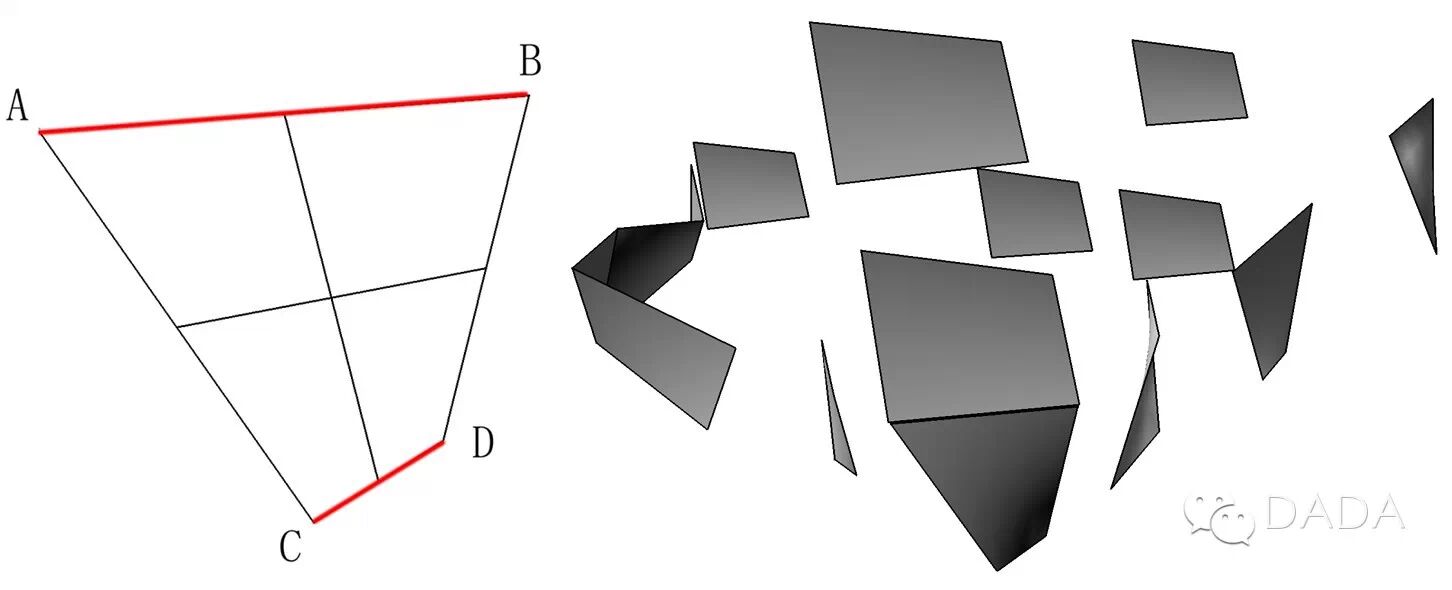 非标准构件的几何形体如果在三维方向同时变化,需要进行三维数控加工,造价高昂。如果将非标准构件的形状变化限定在二维平面内,则造价将大幅降低。走访本地加工厂发现,很多常规的直线形构件也采用数控加工,数控加工技术的普及为设计实现提供了现实基础。加工费用,以数控切割机为例,加工平面内的曲线形构件与加工直线形构件,单位时间的加工费相同,不同之处在于材料的利用率。根据这一加工条件,创展中心将构件形状变化限制在二维平面内,同时利用合理的几何选型,将构件进一步简化为直线性构件,提高材料利用率,降低总体造价。在多种自由曲面类型中,满足这一要求的是由空间中不共面的两条直线定义的规则曲面。沿两条边等分线的连线均为直线。这一特性方便了后期加工,建造过程中的定位也比较方便。规则曲面的弱点在于形态变化不够丰富,因此创展中心采用多组规则曲面的组合,构成丰富的形态变化。