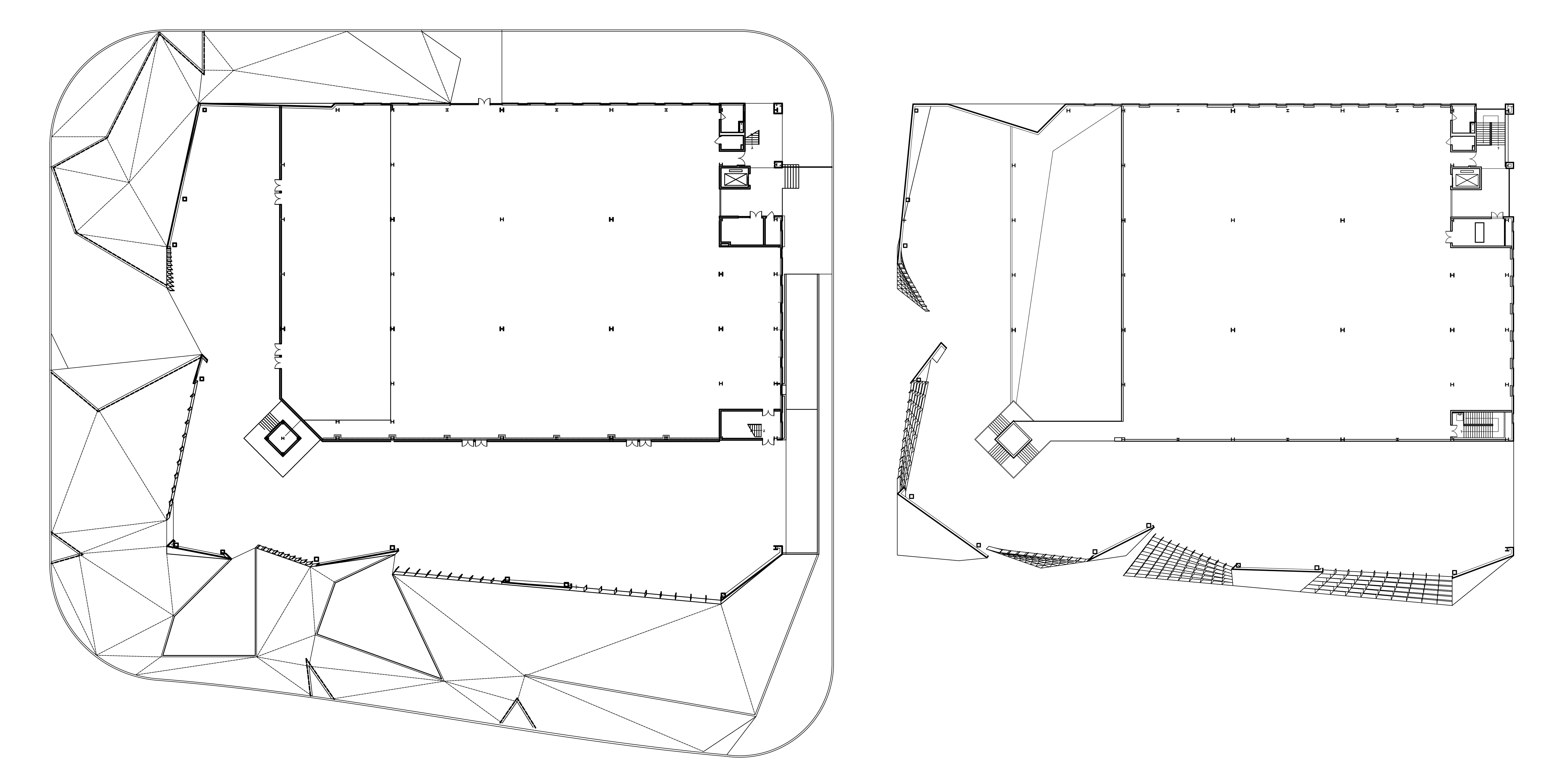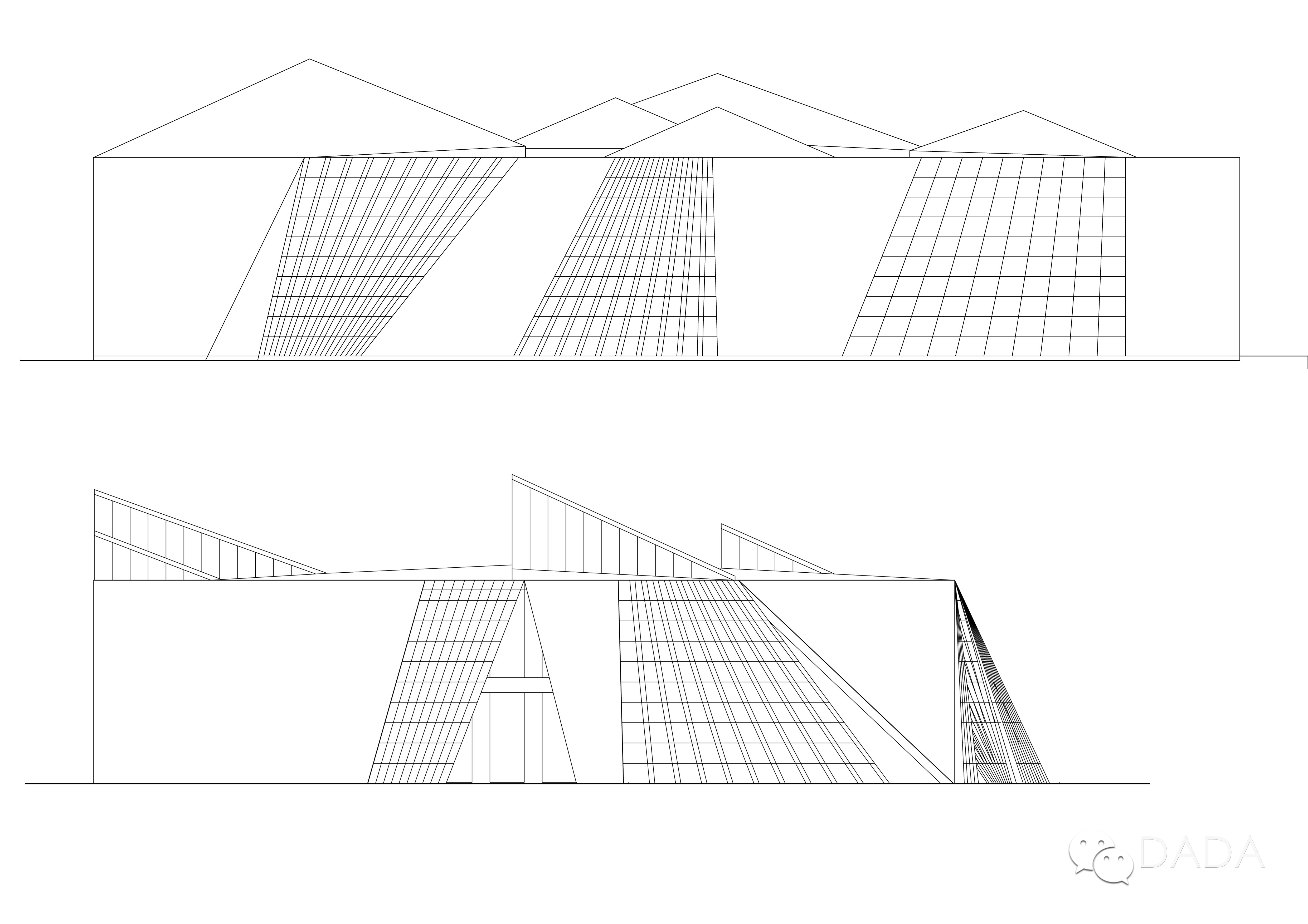 幕墙全尺寸试样焊接完毕后,焊缝的处理成为一个难题。预想的处理方法是焊接完成后逐一打磨,由于焊缝的数量大,打磨费工费时。通过试样发现,打磨用的砂轮在焊缝周边留下明显的痕迹,表面喷涂后痕迹更为明显。如果保留焊缝,整体效果十分粗糙。是否打磨焊缝成为一个两难的设计问题。正当设计陷入困境时,走访加工单位发现用于加工钢板的折弯机,可以精确地按照预定角度将钢板折弯。我们因此提出将三角形幕墙单元两两组合为四边形单元,对角线用折弯机加工,仅焊接四边的工艺。这一方法大幅减少了焊接量。折弯的压痕形成精细的转折线条,与周边粗犷的焊缝形成对比。幕墙整体形成了对角线与四边形两个方向网格交织的特殊肌理,在不同光线下产生微妙的光影变化。